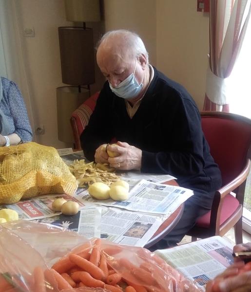 En plus des ateliers pâtisseries les animatrices proposent aux résidents qui le désirent d'éplucher les légumes (pomme de terre / carottes) dans un salon.